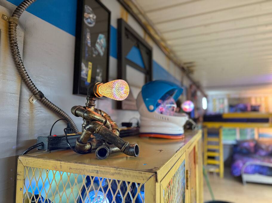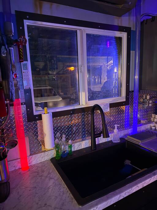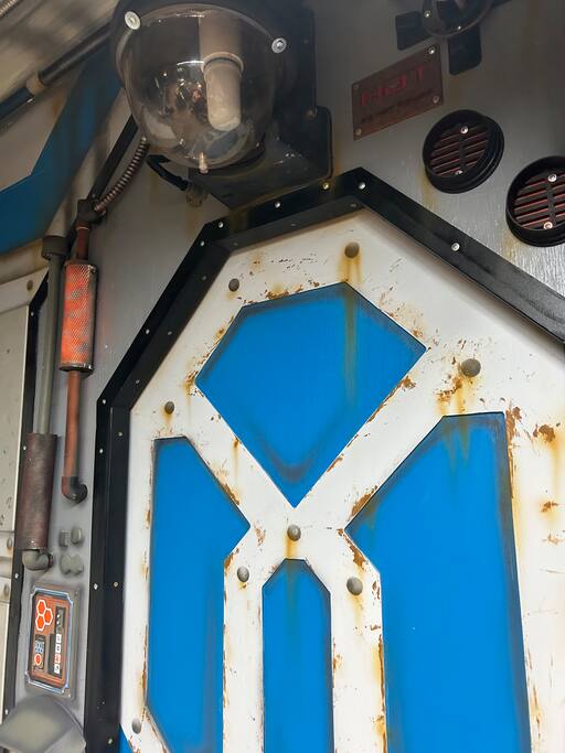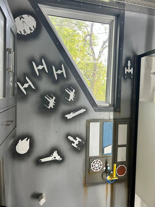 We have 50 acres along beautiful Flint Creek. With 7 different cabins, each one has its own perks! This Cabin looks like the inside of a spaceship, including a observation deck with a telescope to look at the stars and moon!