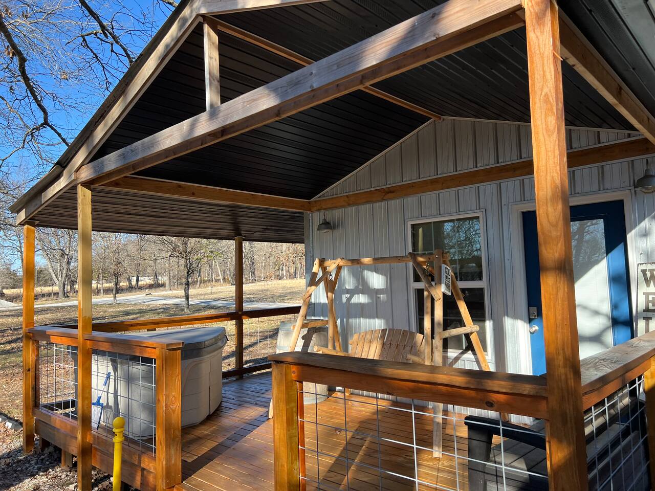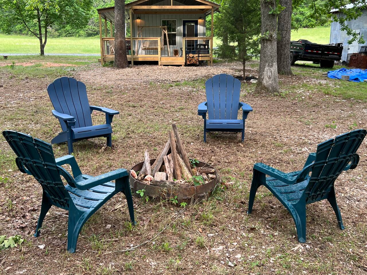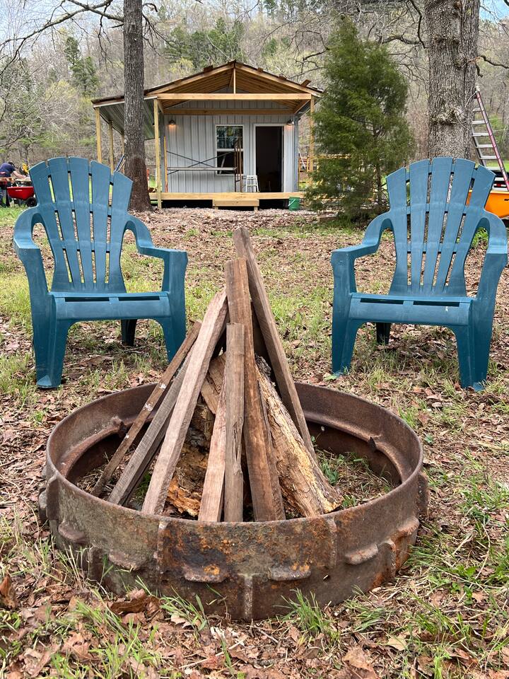 This is a small mini cabin, it was once a Grain Bin, and has been modified into a brand new building. Large kitchen, great porch. And a personal fire pit with bistro lights, enabling you to kick back, relax, and enjoy Flint Creek. Please note. This cabin has a loft bed. Our 6 foot four son can sit upstairs and not touch his head on the ceiling. But there is not enough room for someone to stand.