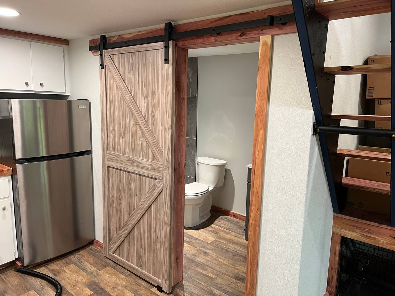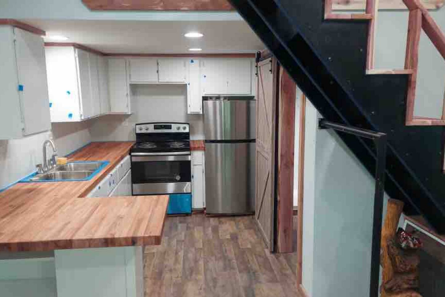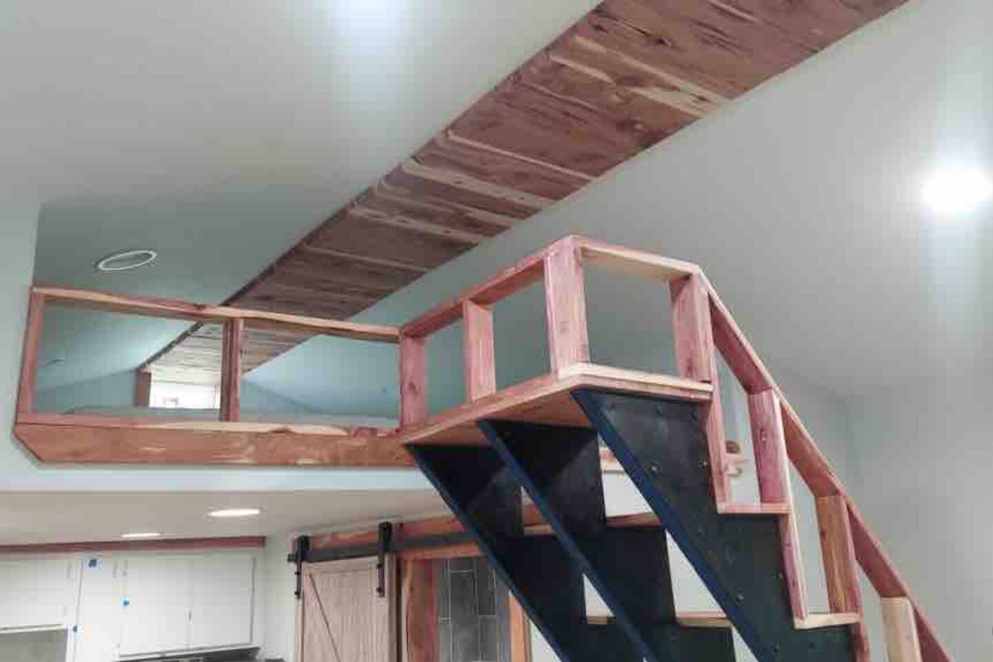 This is a small mini cabin, it was once a Grain Bin, and has been modified into a brand new building. Large kitchen, great porch. And a personal fire pit with bistro lights, enabling you to kick back, relax, and enjoy Flint Creek. Please note. This cabin has a loft bed. Our 6 foot four son can sit upstairs and not touch his head on the ceiling. But there is not enough room for someone to stand.