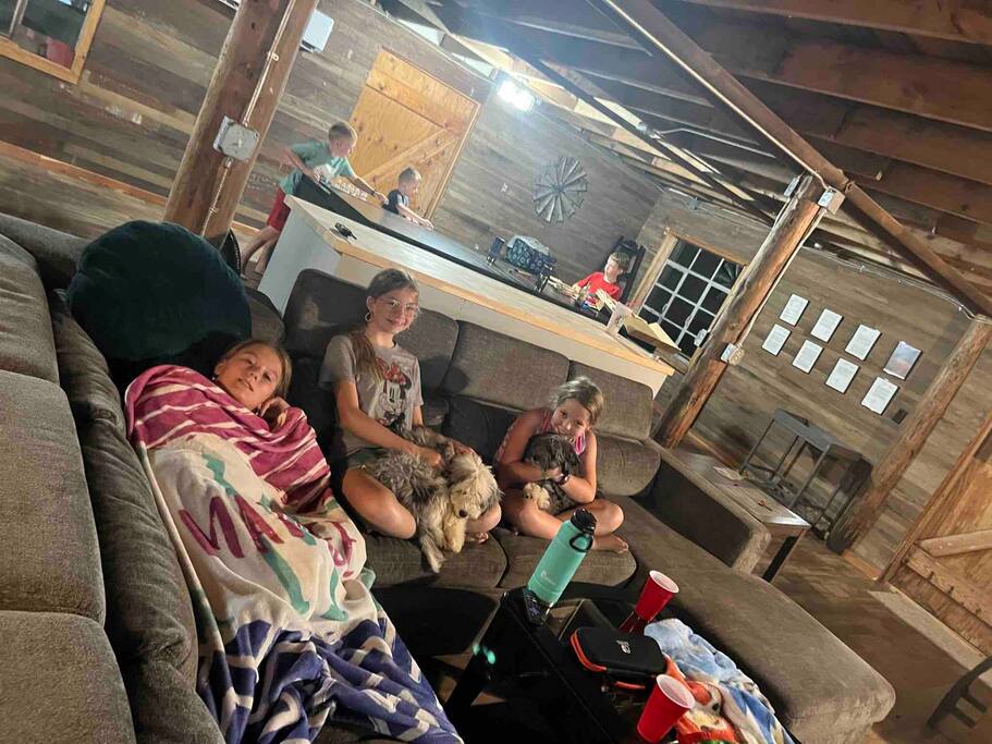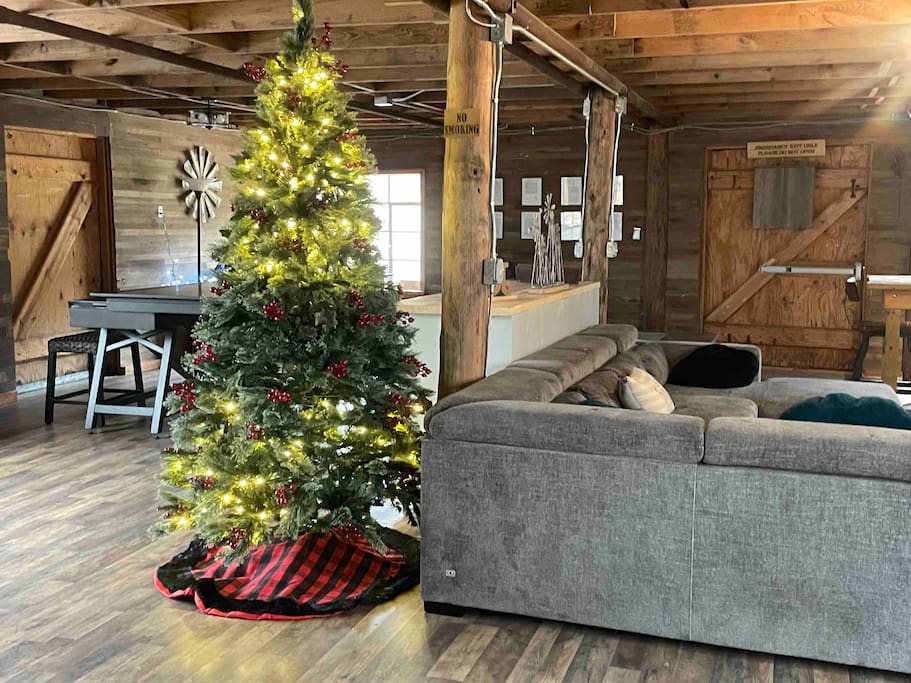 From the outside, it looks like a normal metal building. From the inside…. Perfect lodge type open floor plan with a large kitchen, living room, dinning room with a 75 inch smart tv, a shuffleboard game, a large center island, and a private master bedroom, upstairs a private Bathroom with open area beds. With 11separate beds, it’s perfect for a group setting. Large back deck, grill, and campfire area.