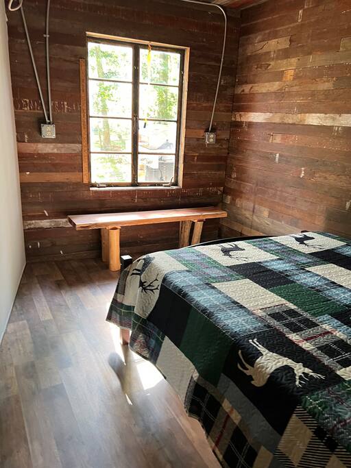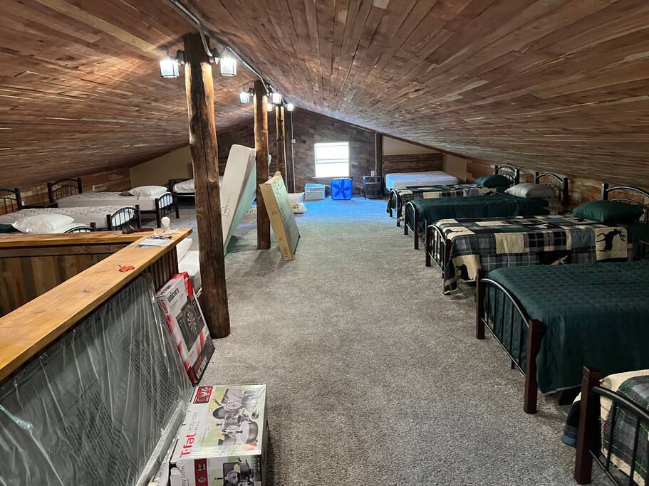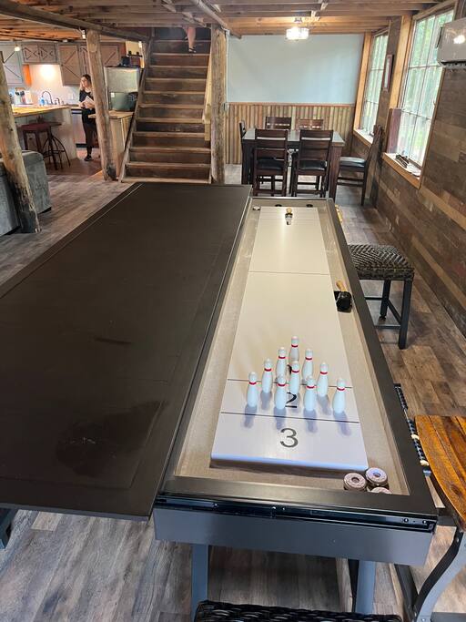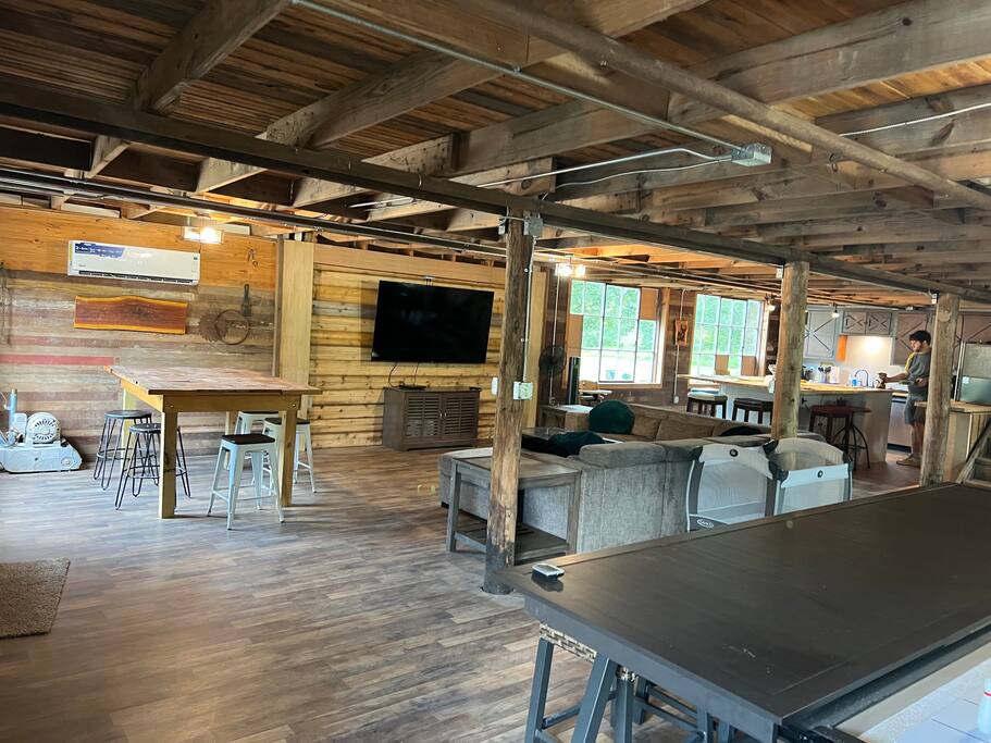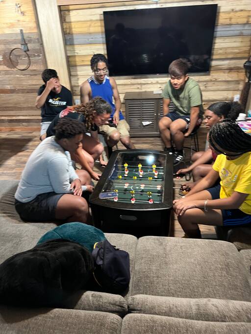 When they were building the cabins on this property, this location is where they would do to wood working. When we first found the property it was filled with all kinds of woodworking tools, wood, and other things. We converted it to have a master bedroom downstairs, and all the other beds upstairs set up orphan style. PERFECT for large groups or family reunions. It has a 75 inch t.v., old school video games, and shuffle board, and foosball.